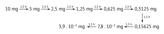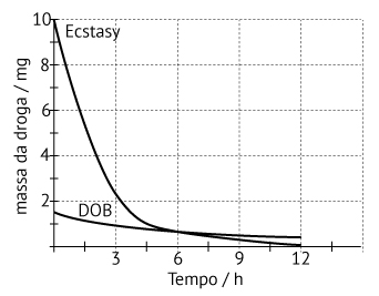 b) Imagine que um indivíduo ingere uma cápsula contendo 1,5 mg de DOB, ao mesmo tempo em que outro indivíduo ingere um comprimido contendo 10 mg de ecstasy. Baseando-se apenas no fato de que a meia-vida do DOB no organismo é de 12 horas e a do ecstasy é de 1,5 horas (uma hora e meia), qual dos dois indivíduos teria maior massa do princípio ativo da droga após 12 horas? Na figura apresentada no espaço para resolução, construa as curvas de decaimento das duas drogas no organismo para justificar sua resposta.